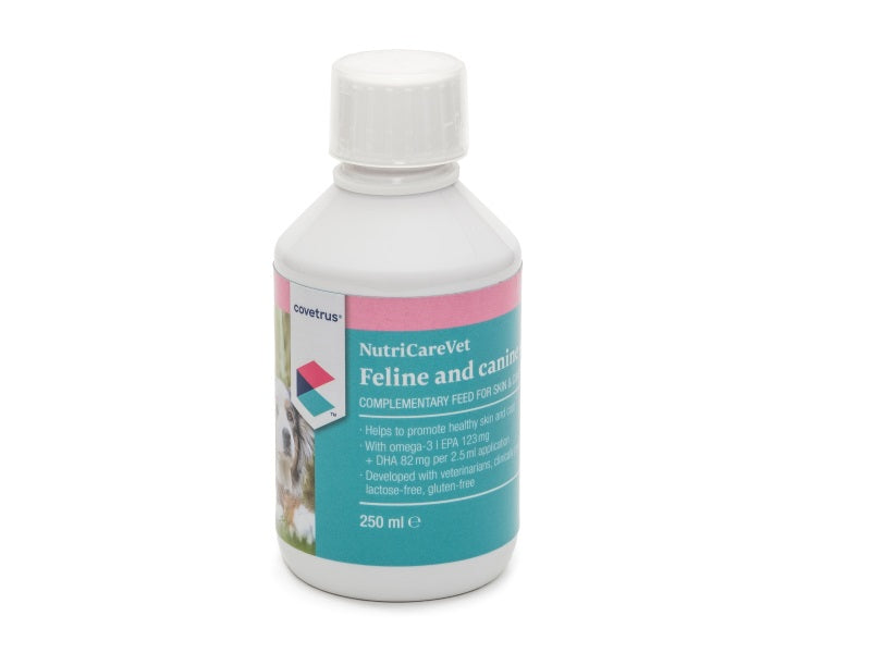 NutriCareVet Feline and canine supplement for skin & coat support liquid supports the health of the skin and coat. The product supports all fatty acid imbalances in the diet and ensures the supply of the right nutrients to maintain a healthy skin and coat.