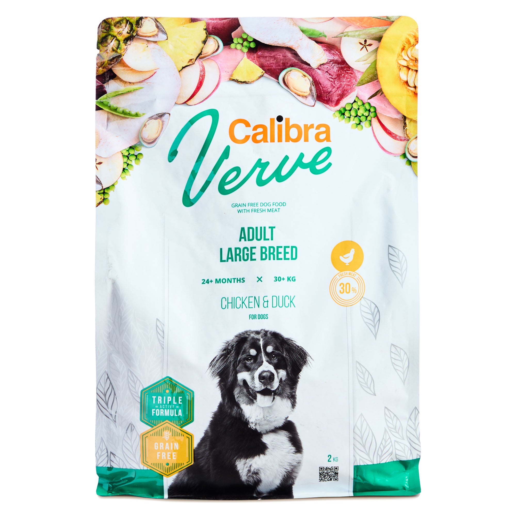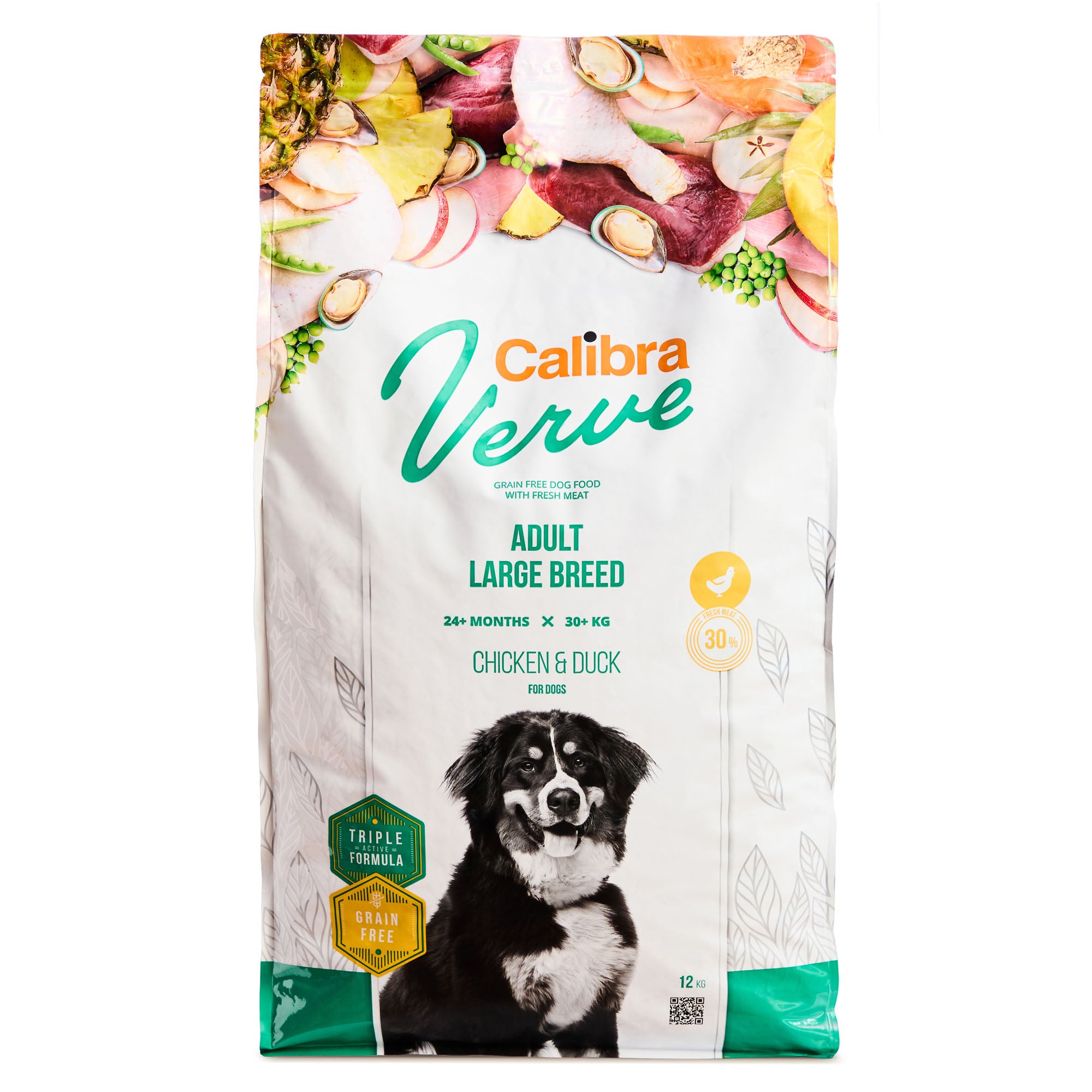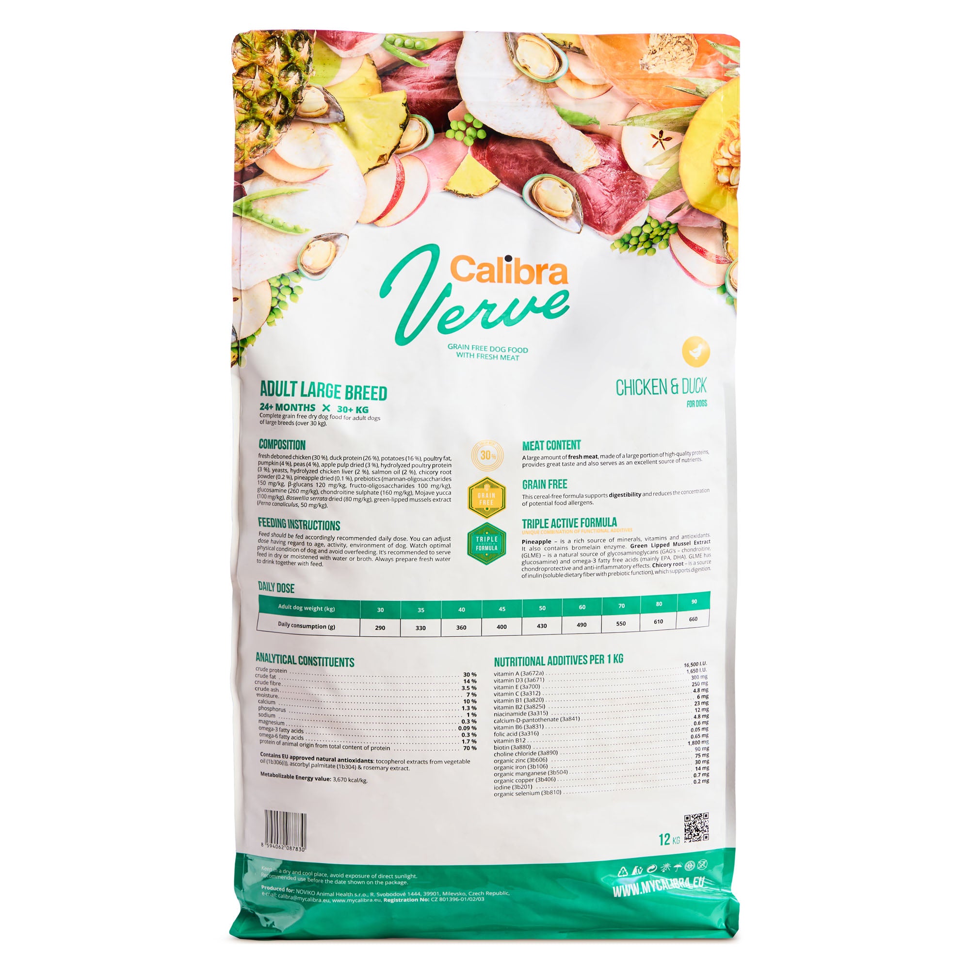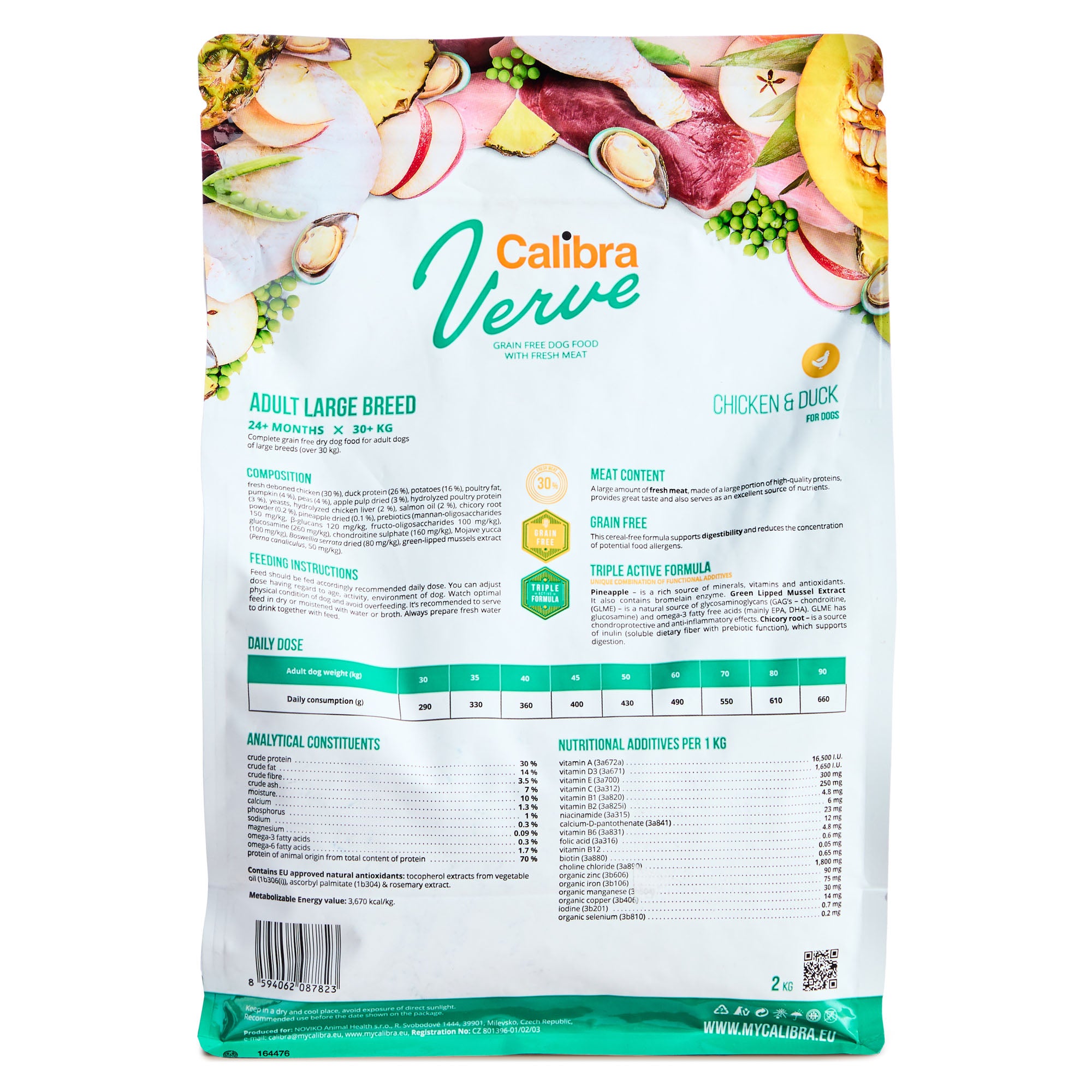 Composition: fresh deboned chicken (30 %), duck protein (26 %), potatoes (16 %), poultry fat, pumpkin (4 %), peas (4 %), apple pulp dried (3 %), hydrolysed poultry protein (3 %), yeasts, hydrolysed chicken liver (2 %), salmon oil (2 %), chicory root powder (0.2 %), pineapple dried (0.1 %), prebiotics (mannan-oligosaccharides 150 mg/kg, β-glucans 120 mg/kg, fructo-oligosaccharides 100 mg/kg), glucosamine (260 mg/kg), chondroitine sulphate (160 mg/kg), Mojave yucca (100 mg/kg), Boswellia serrata dried (80 mg/kg), green-lipped mussels extract (Perna canaliculus, 50 mg/kg).