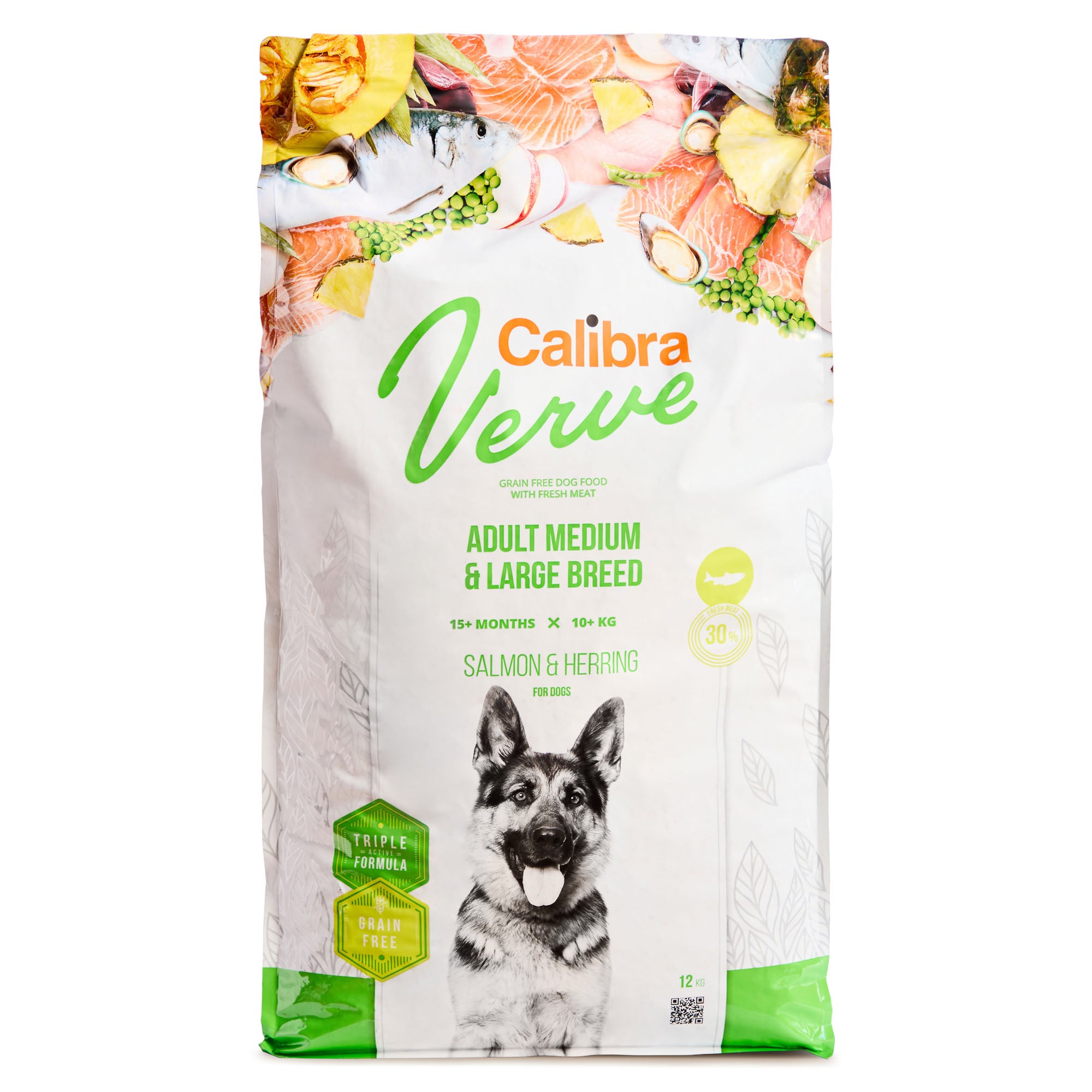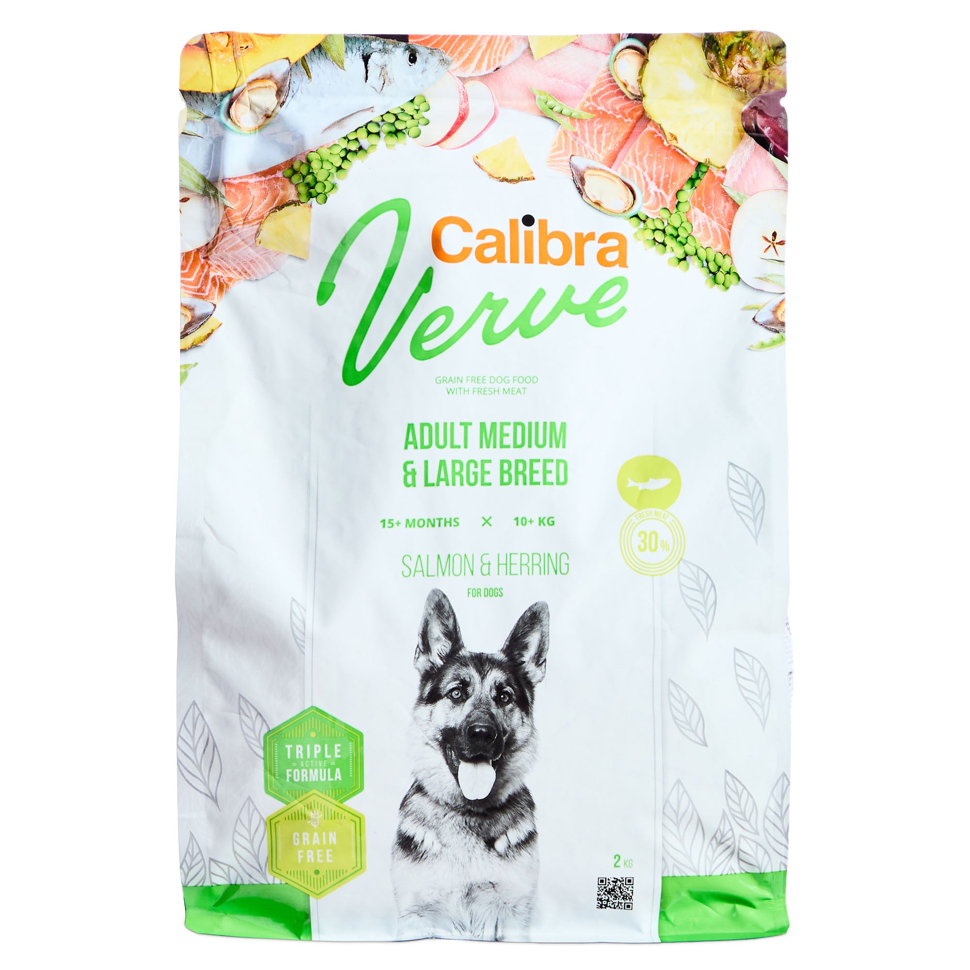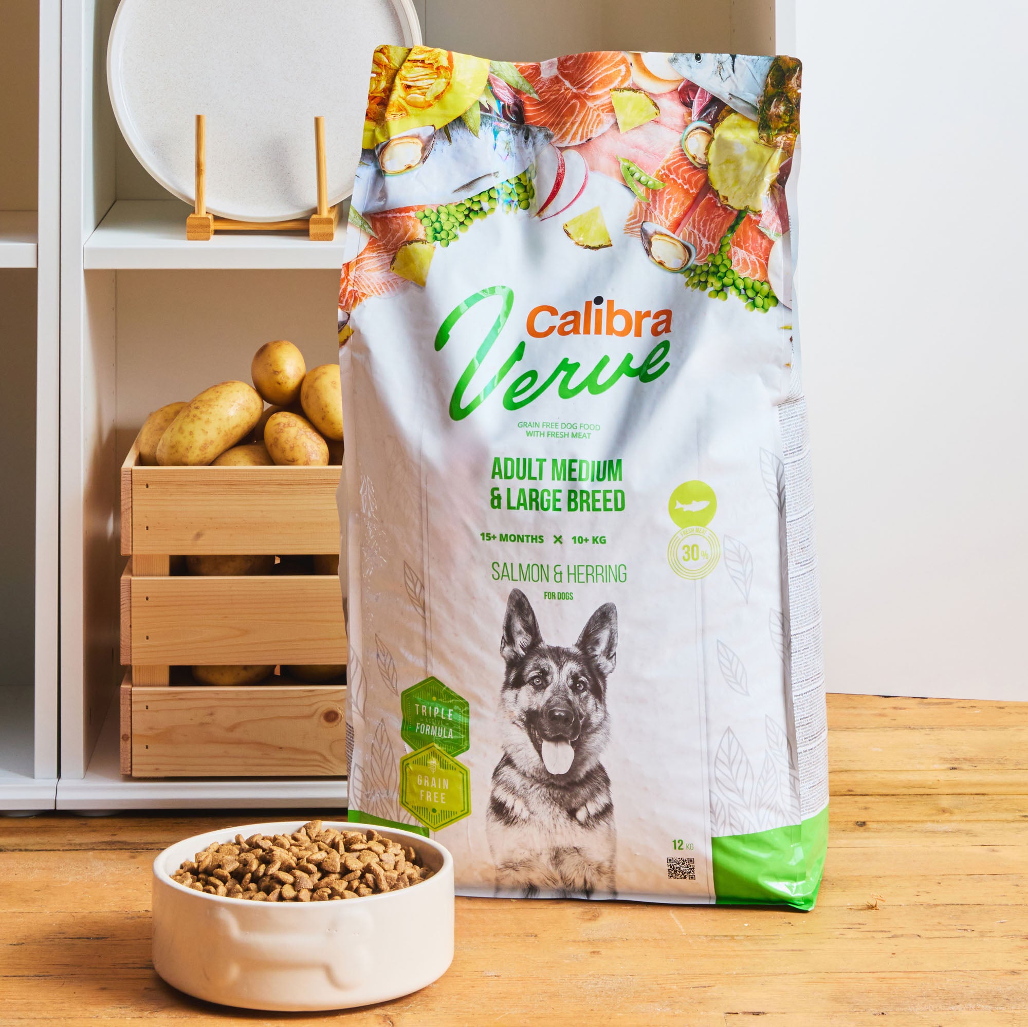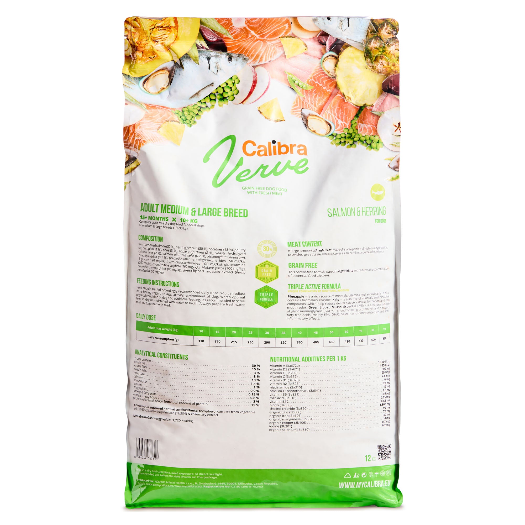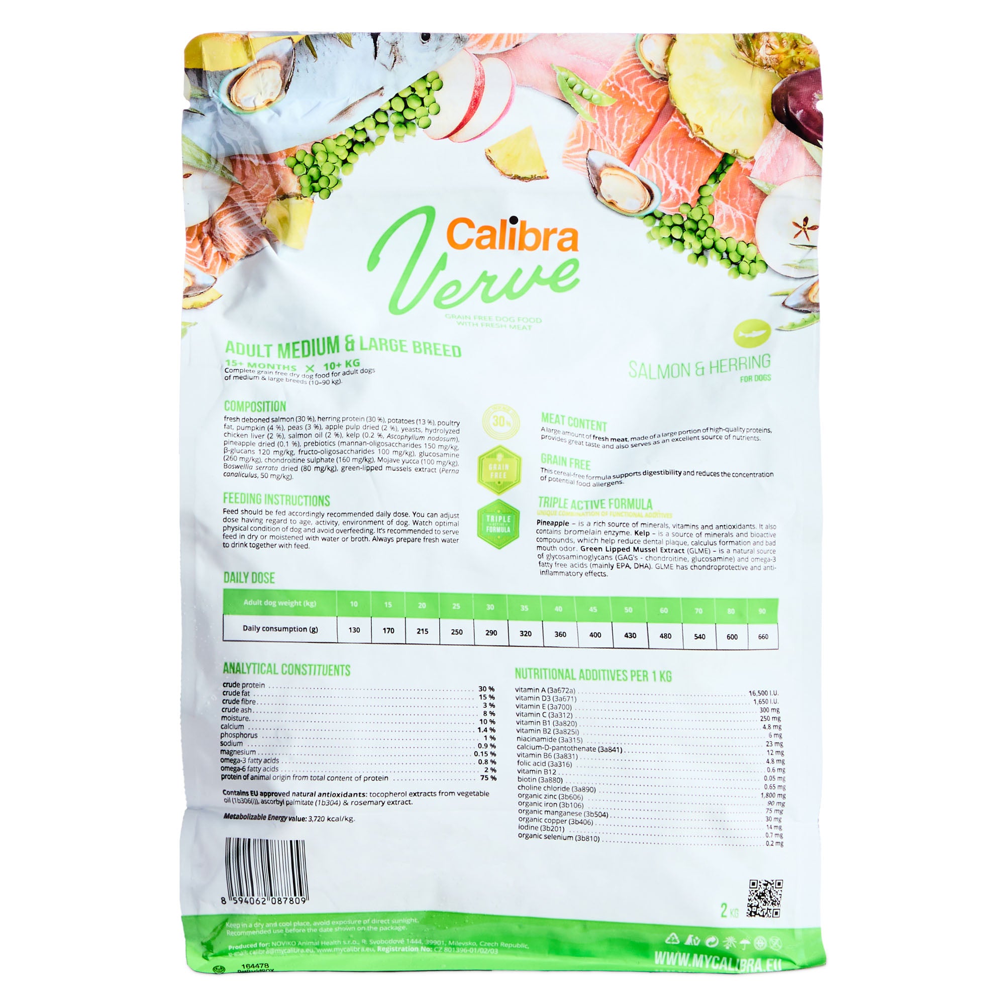Composition: fresh deboned salmon (30 %), herring protein (30 %), potatoes (13 %), poultry fat, pumpkin (4 %), peas (3 %), apple pulp dried (2 %), yeasts, hydrolysed chicken liver (2 %), salmon oil (2 %), kelp (0.2 %, Ascophyllum nodosum), pineapple dried (0.1 %), prebiotics (mannan-oligosaccharides 150 mg/kg, β-glucans 120 mg/kg, fructo-oligosaccharides 100 mg/kg), glucosamine (260 mg/kg), chondroitine sulphate (160 mg/kg), Mojave yucca (100 mg/kg), Boswellia serrata dried (80 mg/kg), green-lipped mussels extract (Perna canaliculus, 50 mg/kg).