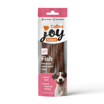 Calibra Joy Fish Salami Treats are semi-moist sticks made with 70% real fish and contain no chicken or wheat. Complementary food for dogs.
